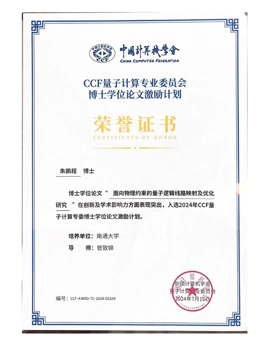 近日,2024年度“CCF量子计算博士学位论文激励计划”评选结果及入选名单正式揭晓。williamhill2018级博士研究生朱鹏程(导师:williamhill英国官网 管致锦教授)论文《面向物理约束的量子逻辑线路映射及优化研究》入选激励计划。