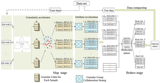 Fig. 1 presents the framework of this work. This paper proposes a Bi-directional Fuzzy Granular-cabin parallel attribute reduction accelerator method with Granular-group collaboration (BiFuG2-Spark) from the perspectives of samples, attributes, granularity, and platforms. This method divides the dataset into smaller subsets and distributes them to multiple compute sub-nodes for parallel processing. A bi-directional fuzzy granular-cabin model is constructed with three virtual samples, and a granular-group collaboration strategy is introduced to accelerate the reduction process. The reductions of each sub-node are finally aggregated on a master-node, and the effective attribute subset can be achieved.