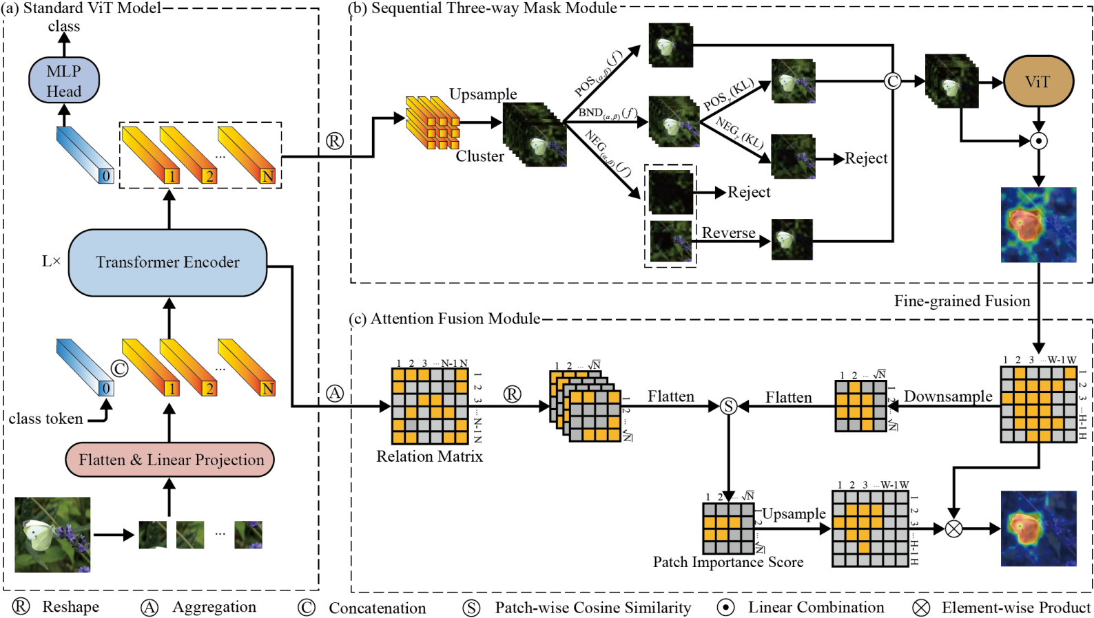 The proposed Transformer explanation method, named the C2F-Explainer, adopts a coarse-to-fine strategy, as shown in Fig. 1. Fig. 1(a) presents the standard ViT module, Fig. 1(b) shows the S3WM module, and Fig. 1(c) displays the AF module. Due to the uncertainty of mask quality, this study puts the mask set into the S3WM module. The multi-granularity level sequential analysis is conducted to select positive mask setsMp that are used to perturb an image to generate a preliminary explanation resultS. The resultS can accurately locate object positions but often contains background noise, so the interpretation results are coarse-grained. Subsequently, this study analyzes the self-attention mechanism, explores the interaction of image blocks, and proposes the AF module. This module uses cross-layer attention information to generate a relation matrixR, which is used to optimize detailed information in the explanation results. Finally, an optimal fine-grained explanation resultV is generated, effectively improving the model’s interpretability.