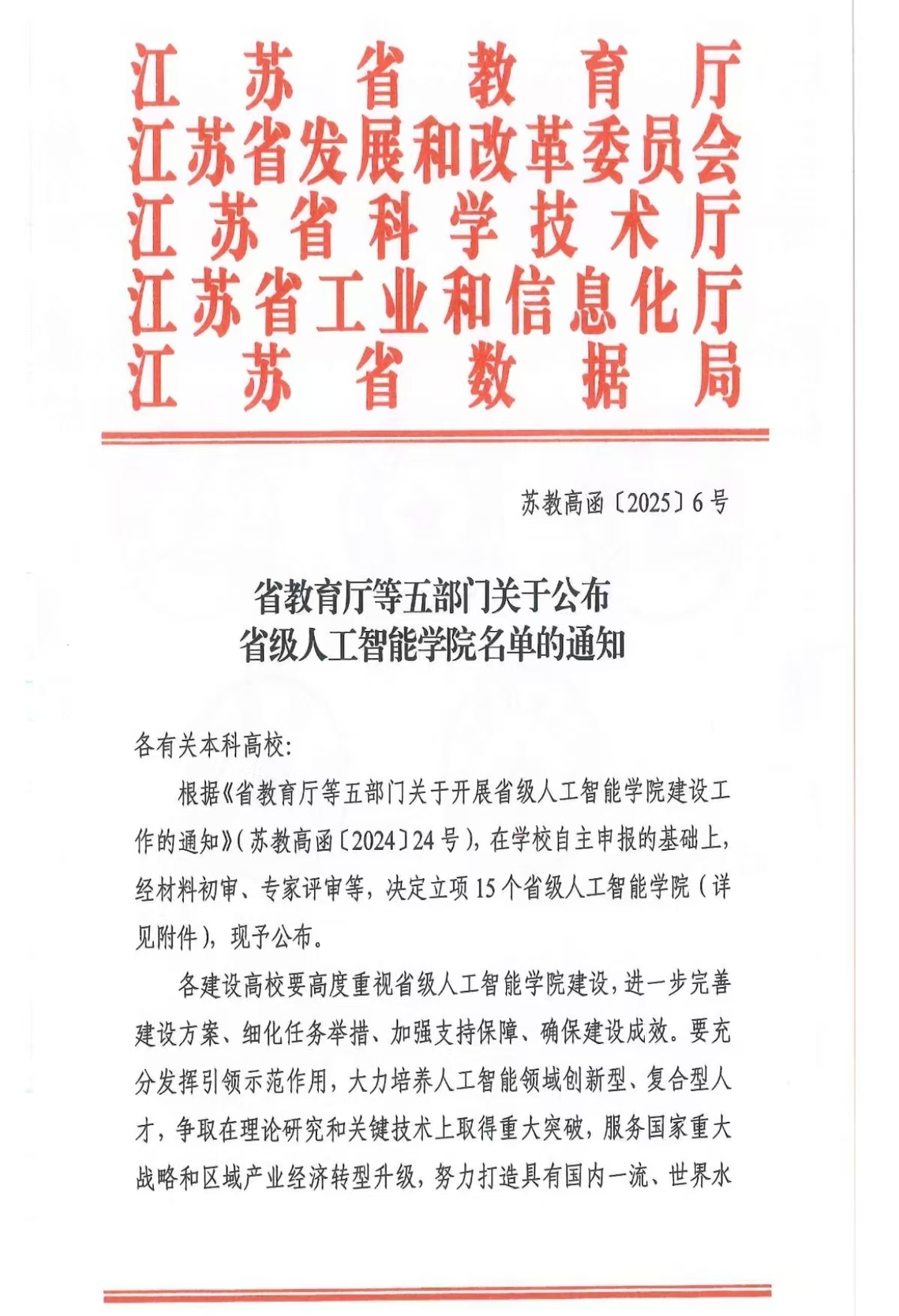 近日,根据《省教育厅等五部门关于开展省级人工智能公司建设工作的通知》(苏教高函〔2024〕24号),公司williamhill英国官网获评江苏省首批15个省级人工智能公司。
